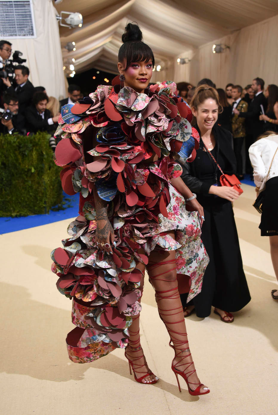 No tapete vermelho, a principal inspiração para o look das famosas foi a estética avant garde e conceitual de Kawakubo. Rihanna se destacou ao escolher um look da marca homenageada e mais uma vez respeitar o tema do evento. Do moderno ao abstrato o que mais chamou a atenção foram os volumes e texturas nos visuais de famosas como Blake Lively, Cara Delevingne e Lily Collins.
