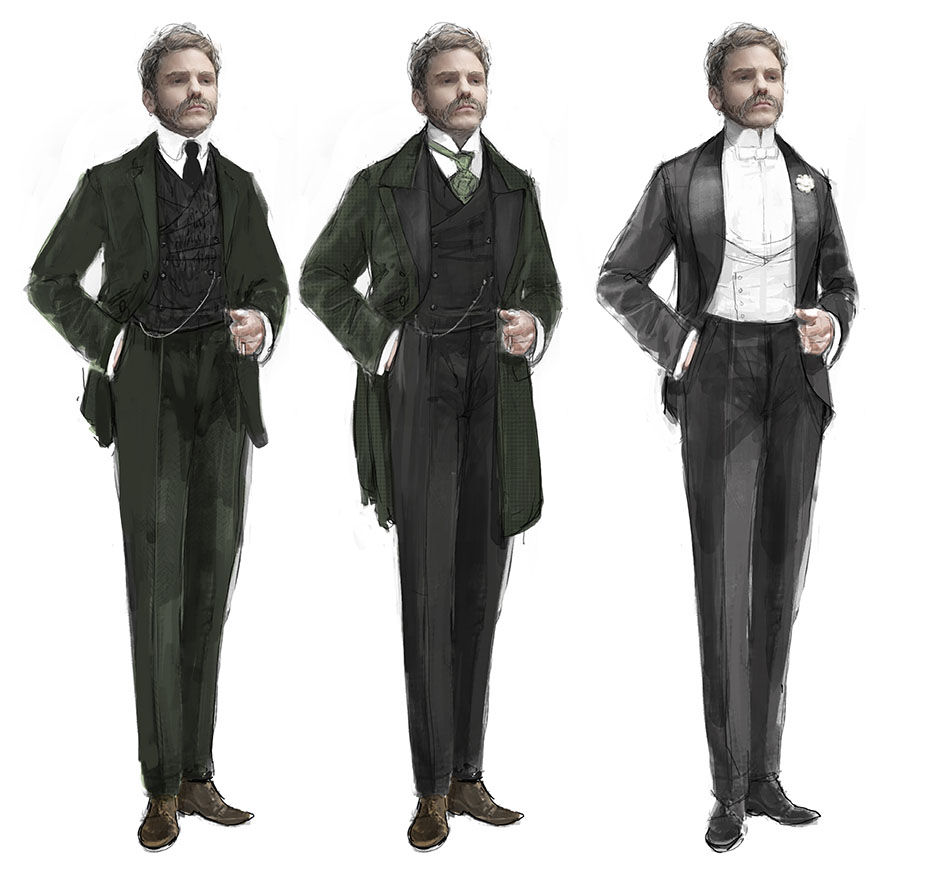 The main male characters John Moore and Dr. Laszlo Kreizler have a totally different look, while the former behaves like a Dandy, extremely vain and daring in his choices, the second is rather restrained and classic choosing pieces that make him look older.